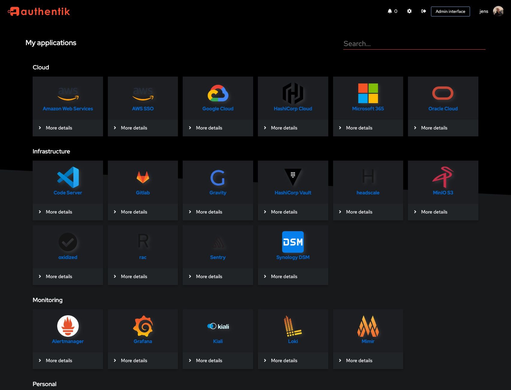 • User interface: this console view in authentik displays all of the applications and integrations in which you have implemented authentik. Click on the app that you want to access to open it, or drill down to edit its configuration in the admin interface.
